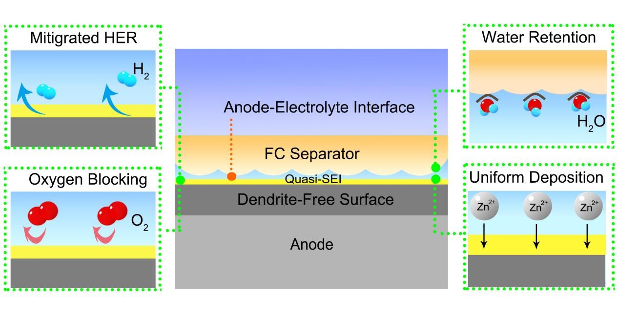 这项工作采用了一种简单实用的方法进行功能化隔膜的制备,可在锌镍电池中有效调控电极-电解液的界面特性,抑制电池中多项副反应的发生,提高锌镍电池的循环寿命和日历寿命,有望为下一代锌镍电池功能化隔膜的产业化提供广阔的应用前景。论文指导教师为钟澄教授和胡文彬教授。