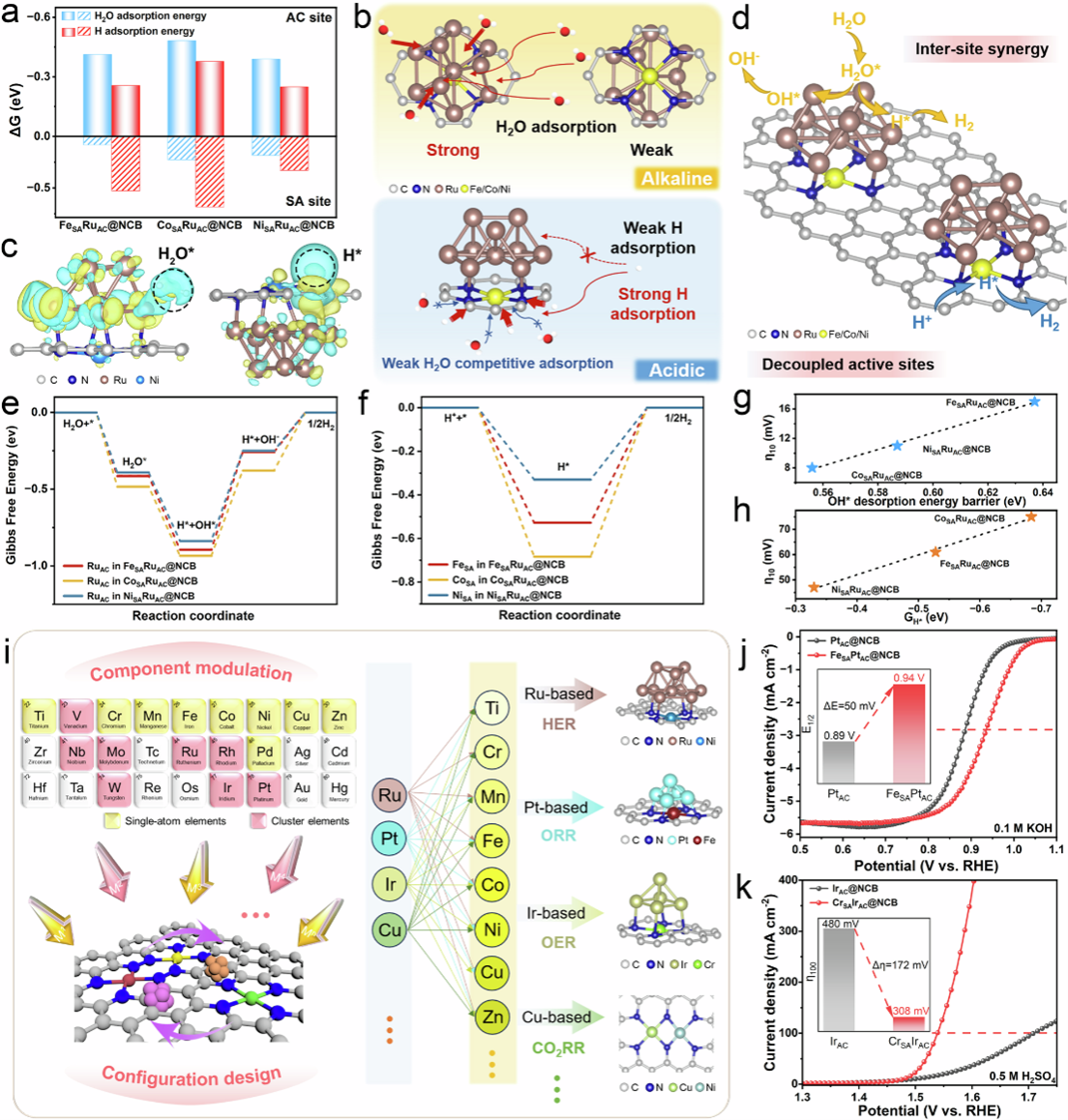 结合实验观察和理论计算进一步了解潜在的电催化机制。MSARuAC复合位点催化剂具有双催化活性中心,活性中心的解耦使得MSARuAC@NCB在酸性和碱性HER中均表现良好,而且共生的MSA和RuAC之间的内在电子相互作用对放氢动力学的增强产生了中心间的协同效应。