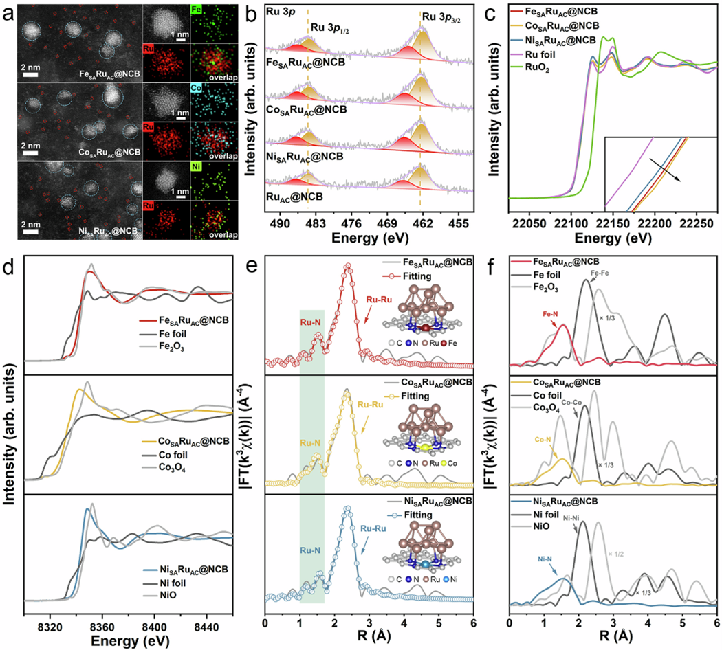 选择双金属MSARuAC@NCB(M = Fe,Co,Ni)作为研究对象,以了解双/多金属SA/AC复合材料库的精细结构和电催化性能。HAADF-STEM图像和EDS证实了RuAC和孤立的(Fe/Co/Ni)SA的共存。为了研究相邻的MSA和RuAC之间的自然相互作用,通过X射线光电子能谱(XPS)研究了电子结构。通过X射线吸收近边结构(XANES)谱进一步分析了复合材料中共生的MSA和RuAC之间的内在电子相互作用。利用EXAFS谱对MSARuAC复合材料的原子构型进行了解析,小波变换(WT)分析也确定了Ru-N和Ru-Ru路径的共存。对于MSARuAC@NCB中的Fe/Co/Ni物种,在R空间中的EXAFS谱显示出明显的最近邻峰和M-M峰的缺失。WT-EXAFS也显示只有一个最大强度归因于M-N键,这表明形成了单个Fe/Co/Ni原子。