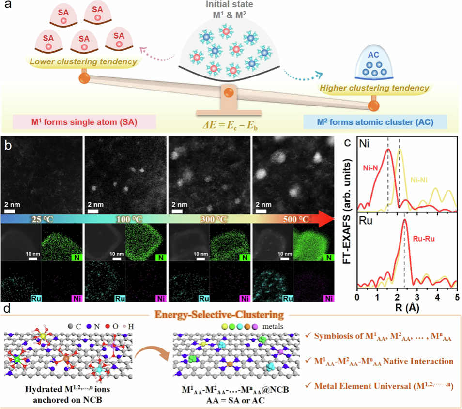 从本质上讲,孤立金属原子的聚合是由固有的金属内聚力和金属-支撑相互作用(MSI)主导的。从热力学的角度来看,团聚的驱动力是内聚能(Ec),阻力是金属-基质结合能 (Eb)。因此,金属原子的聚集趋势取决于内聚能和结合能(ΔE = Ec - Eb)。如图1所示,考虑到一个基底上的两个孤立金属原子元素(M1、M2),高温烧结可促使具有较高团聚倾向的金属形成原子团簇(AC)。同时,团聚倾向较低的金属会形成更稳定的单原子(SA)种类。基于这一能量控制的选择性团簇过程,利用金属的不同团簇倾向,可以制备M1SA-M2SA、M1SA-M2AC或M1AC-M2AC。本工作中选择Ni和Ru双金属对来验证这一原理。HAADF-STEM图像和相应的EDS证明了前体中Ni/Ru的孤立原子构型。有趣的是,Ni和Ru在随后的烧结中表现出不同的聚集行为。在100 °C下,Ru原子聚集成亚纳米原子团簇(RuAC)。相反,Ni原子形成稳定的单原子物种(NiSA)。300 °C和500 °C的较高温度进一步增加了RuAC尺寸,但仍然不能诱导NiSA的聚集。NiSA和RuAC构型通过同步辐射扩展X射线吸收精细结构(EXAFS)光谱进一步得到了验证。