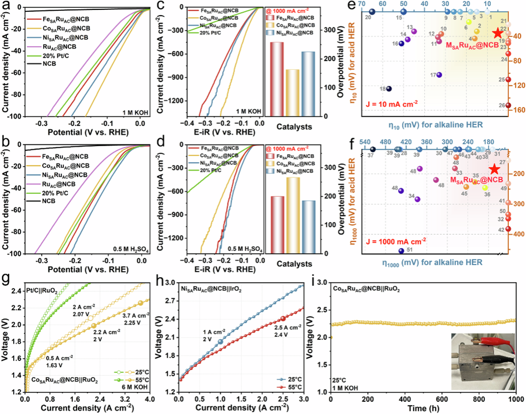 通过DFT计算,选择了HER高催化活性的潜在M1SAM2AC位点。考虑了十种不同的M1SAM2AC模型。通过理论能量标准筛选出了 NiSARuAC、FeSARuAC和CoSARuAC。分别在0.5 M H2SO4和1 M KOH 电解质中评估了合成的 FeSA/CoSA/NiSA@NCB的HER性能,证明了其在提高电催化性能方面具有潜在的协同作用机制。在实用碱性水电解槽(AWE)、质子交换膜水电解槽(PEMWE)和阴离子交换膜水电解槽(AEMWE)中进一步验证了MSARuAC@NCB的应用潜力。与基于铂/铂阳极的对应器件和之前报道的其他AWE器件相比,该性能属于最高之列。另外,组装的AEMWE电解槽可以在1 A cm-2的工业级电流密度下稳定运行 1000 小时。