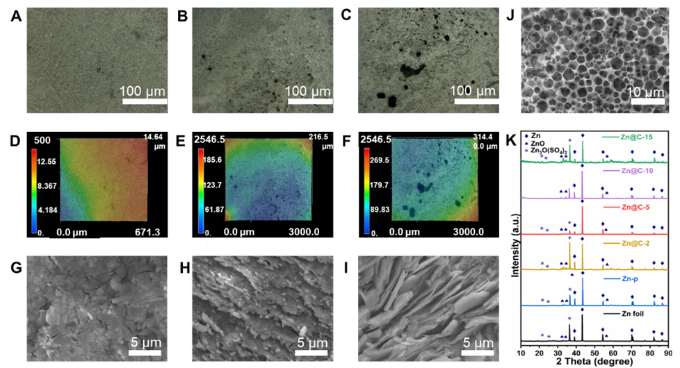 图4. 对称电池循环后电极表征:(A)碳网络增强锌粉负极,(B)纯锌粉负极,(C)锌箔对称电池循环100圈后表面光镜照片。(D)-(F)相应三维超景深图。(G)-(I)相应SEM图。(J)对称电池循环后电极XRD图谱。