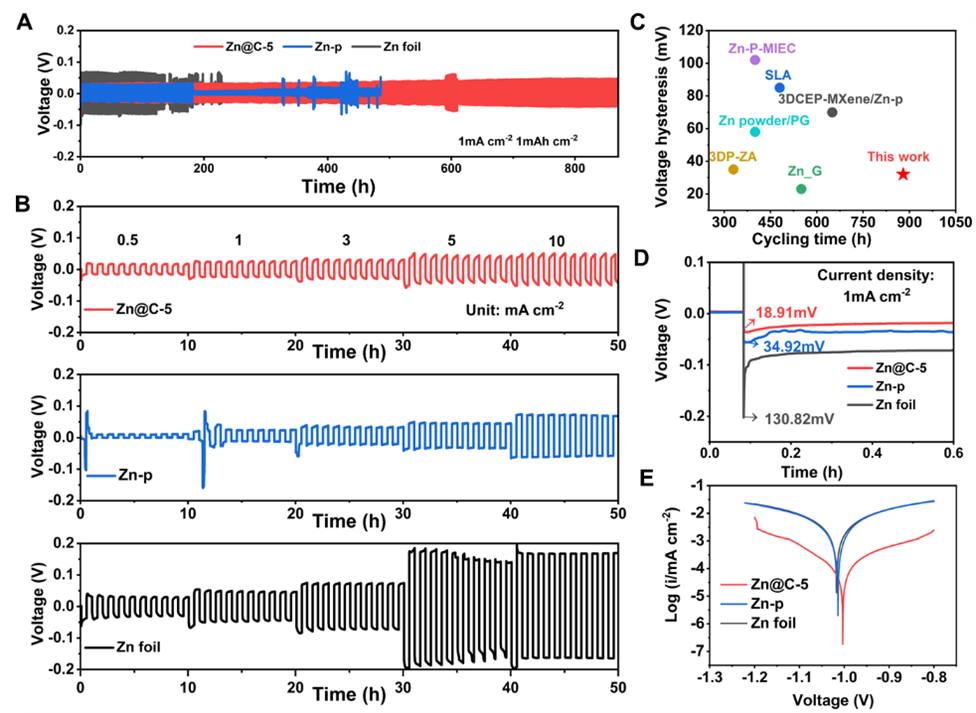 图3.对称电池性能:(A)对称电池循环。(B)对称电池倍率性能。(C)碳网络增强锌粉负极与其他锌粉负极性能比较。(D)成核过电位。(E)Tafel极化曲线。