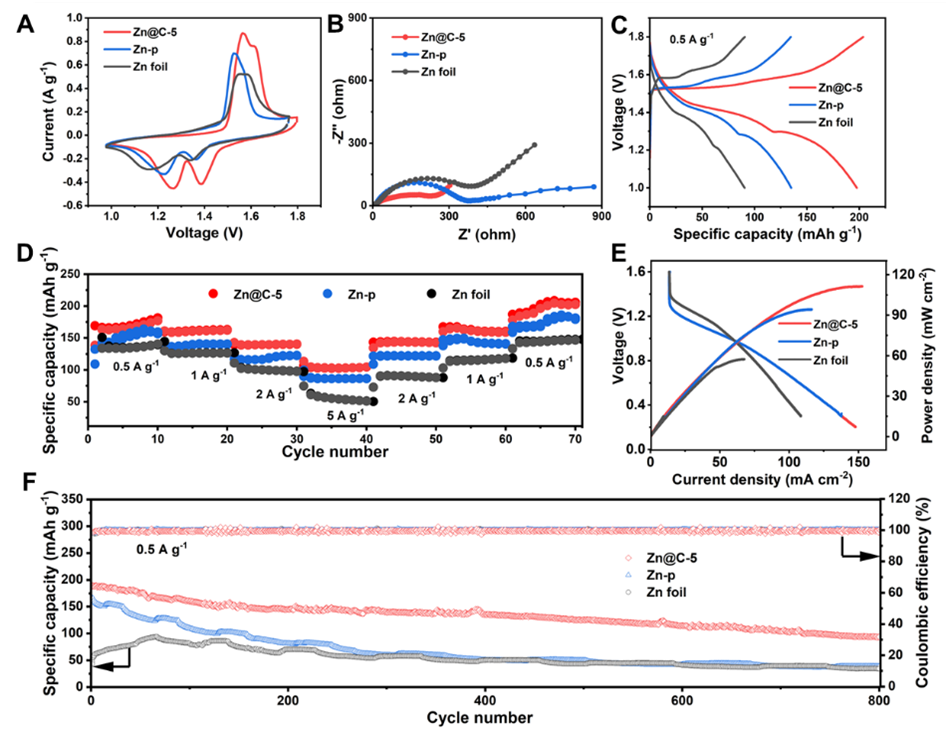 图6. 碳网络增强锌粉负极在水系锌基电池中的性能:该电极在水系锌离子电池中的(A)循环伏安曲线,(B)电化学阻抗谱,(C)充放电曲线,(D)倍率性能。(E)锌空电池中的LSV曲线和相应的功率密度曲线,(F)全电池长循环曲线。