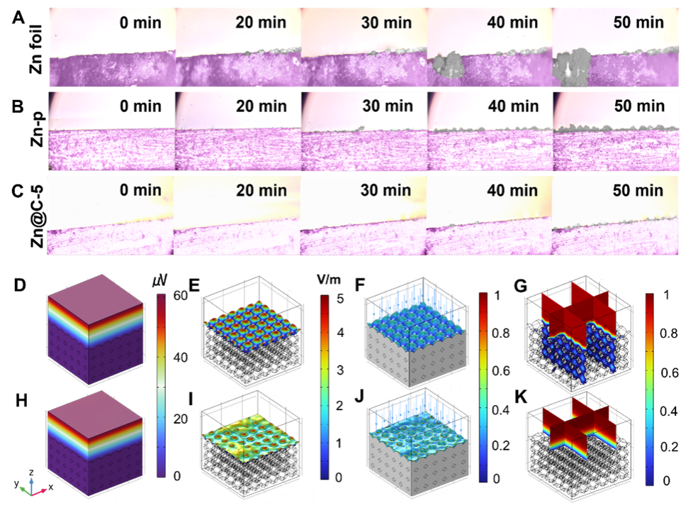 图5. 原位表征与理论模拟:(A)锌箔,(B)纯锌粉负极,(C)碳网络增强锌粉负极在原位光镜下的沉积行为。(D)-(G)纯锌粉负极表面电场,电势场,电流场和离子浓度分布的理论模拟,(H)-(K)碳网络增强锌粉负极表面电场,电势场,电流场和离子浓度分布的理论模拟。