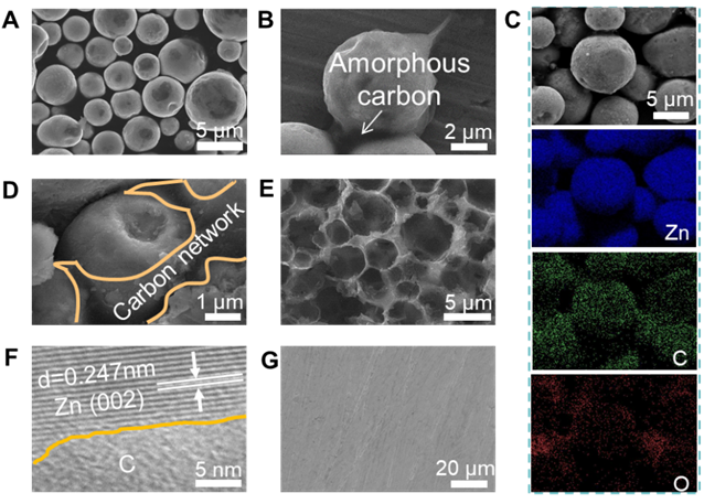 图2. 复合锌粉及复合块体材料形貌表征:(A)纯锌粉SEM图,(B)包裹碳层的复合锌粉SEM图,以及(C)复合锌粉相应元素分布图。(D)块体截面SEM图,(E)块体刻蚀锌后剩余骨架SEM图。(F)碳网络锌粉复合块体材料内部TEM图。(G)碳网络锌粉负极表面SEM图。