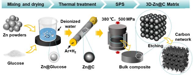 图1. 碳网络增强锌粉负极的合成过程示意图