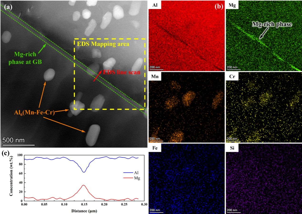 图2. (a)敏化AA5083的HAADF-STEM图;(b)(a)中黄色虚线区域的EDS面扫描图;(c)(a)中红色箭头处的EDS线扫描分析。