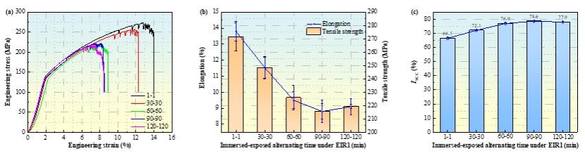 图3. 不同浸入–露出交替时间下敏化AA5083的SSRT试验结果:(a)工程应力-应变曲线,(b)抗拉强度和延伸率,(c)应力腐蚀敏感因子。