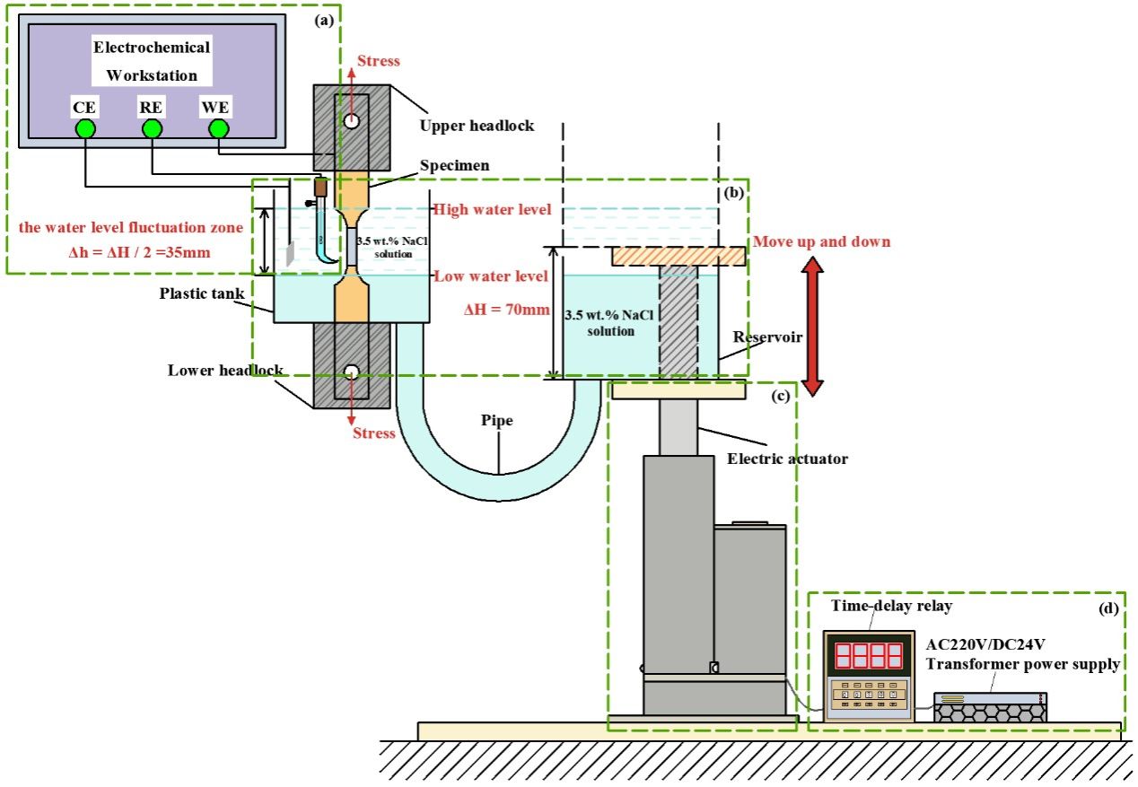 图1. 浸入–露出循环下的SCC模拟装置示意图:(a)电化学测试系统,(b)连通器,(c)电动推杆,(d)时间控制系统。