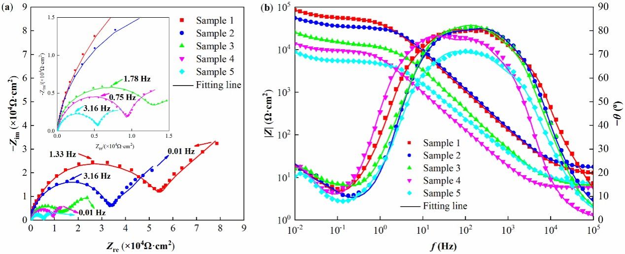 图4. 不同条件下敏化AA5083样品的EIS图:(a)Nyquist图,(b)Bode图。