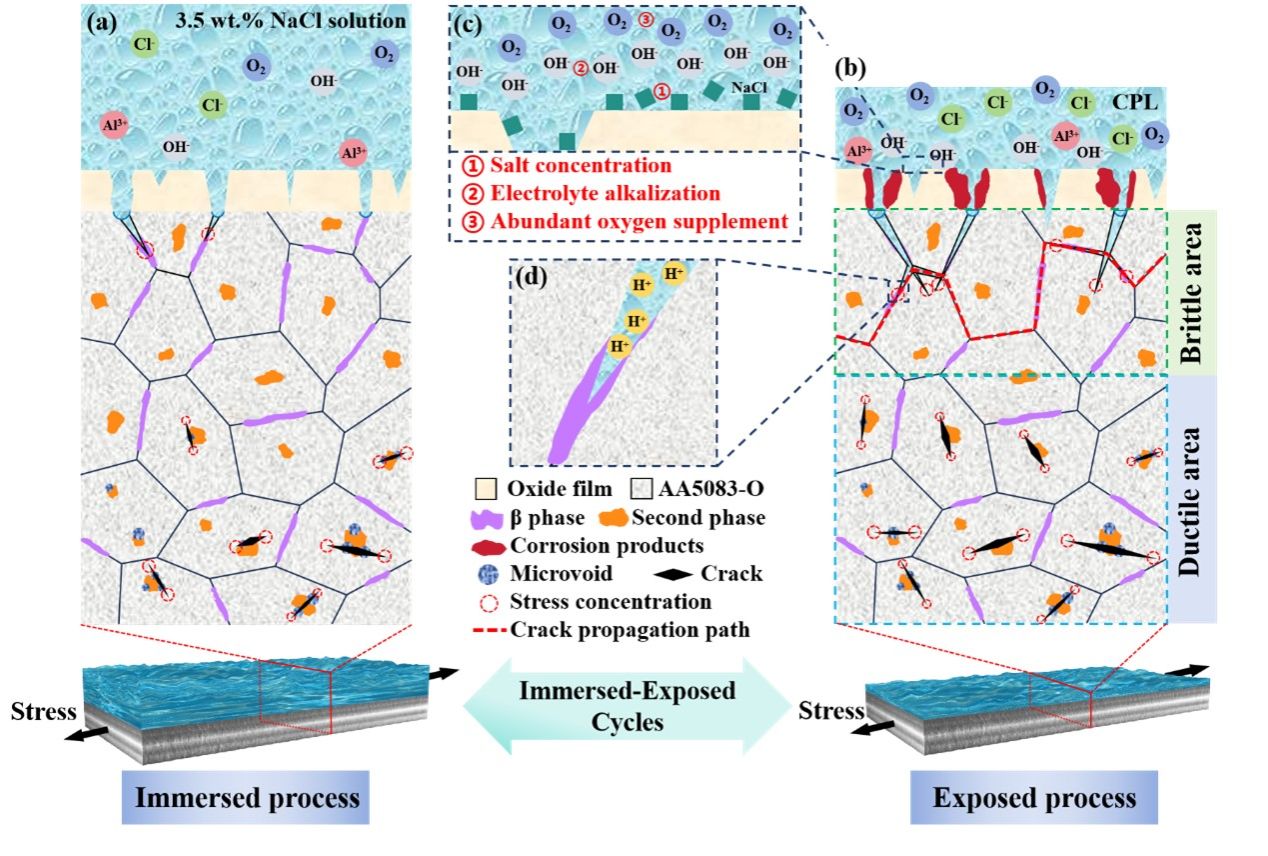 图5. 浸入-露出交替环境中敏化AA5083的SCC机理图:(a)浸入过程,(b)露出过程,(c)薄电解质层放大图,(d)裂纹尖端放大图。
