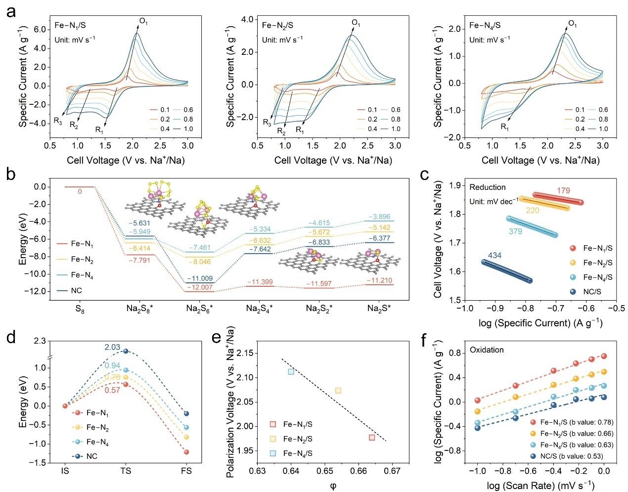 本研究通过多扫速CV分析和理论计算揭示了不同Fe‒Nx位点对钠硫电池硫氧化还原动力学的调控机制。实验表明,不饱和Fe-Nx位点(尤其是Fe‒N1)显著提升硫转化动力学。吉布斯自由能计算证实Fe‒N1位点将Na2S6向Na2S4转化能垒降至最低(0.57 eV),成为控制步骤的关键催化位点。其中,电子结构描述符φ与CV曲线中O1峰(与Na2S分解相关)电位呈线性相关,Fe‒N1位点的低φ值(0.664)对应最小分解能垒(0.57 eV)和最高氧化峰b值(0.78),证实其通过优化电子结构有效促进固相Na2S分解。不同Fe‒Nx位点对比实验系统论证了位点不饱和度与催化活性的正相关性,其中Fe-N1位点因高度不饱和特性展现出最优的硫利用效率和反应动力学。