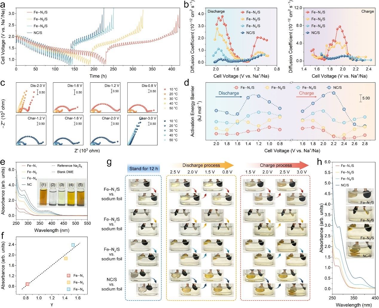 Fe‒Nx位点的几何结构也会对硫氧化还原反应动力学及多硫化钠(NaPSs)行为产生影响。通过恒电流间歇滴定技术(GITT)分析发现,具有高度不饱和Fe‒N1位点的正极表现出更低的过电势和更高的钠离子扩散系数,尤其在放电阶段1.7~2.0 V和充电阶段2.0 V附近展现出优异的Na+传导能力,而饱和Fe‒N4位点对短链多硫化物的催化转化受限。结合阿伦尼乌斯方程拟合多温度阻抗谱,Fe‒N1/S正极在硫还原和氧化反应中的活化能最低(分别为4.8和1.8 kJ·mol‒1),显著优于其他结构。理论计算与实验表明,Fe‒N1位点独特的缺电子几何结构不仅能通过强吸附有效抑制多硫化物的溶解和穿梭效应,还能加速多硫化物的催化转化。这些发现揭示了Fe‒Nx位点几何不饱和度对提升钠硫电池性能的关键作用。