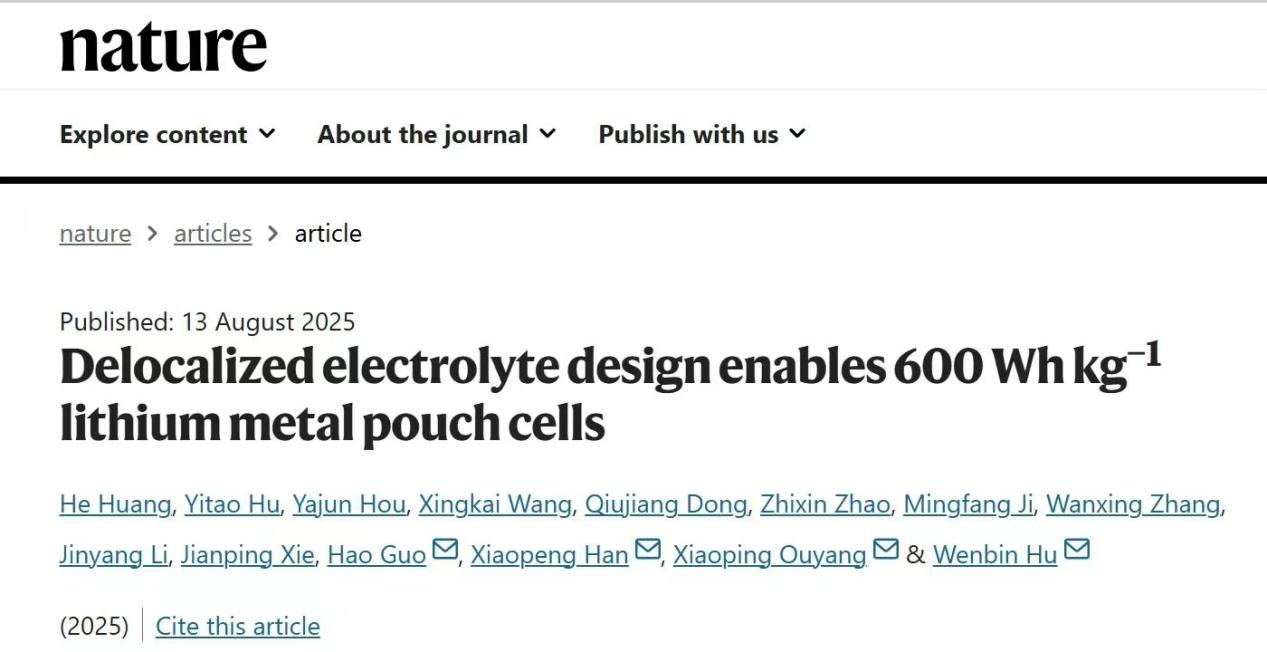 文章信息:H. Huang, Y. Hu, Y. Hou, X. Wang, Q. Dong, Z. Zhao, M. Ji, W. Zhang, J. Li, J. Xie, H. Guo, X. Han, X. Ouyang, W. Hu, Delocalized Electrolyte Design Enables 600 Wh kg−1 Lithium Metal Pouch Cells, Nature, 2025.