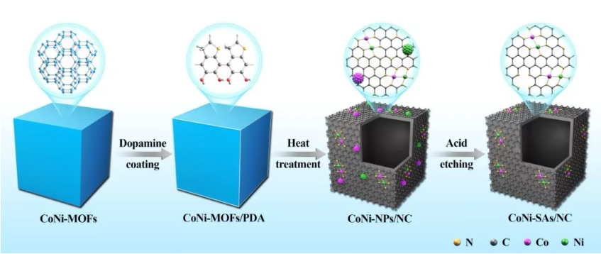 图2. 热解多巴胺涂层的金属有机框架制备CoNi-SAs/NC复合物高效双功能催化剂
