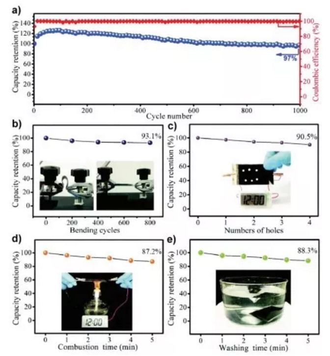 本文报道了一种基于近中性凝胶聚合物电解质的新型锌空气电池。 该电解质具有较好的保水性和高离子电导率。 相比于传统碱性电池体系,本文中性锌空气电池表现出更好的环境友好性和锌电极耐腐蚀性,并且可以有效避免碳酸盐化问题。 此外,利用具有扩大的界面接触面积和催化部位的集成纳米孔空气阴极,其显示出优异的柔韧性和高强度。 基于以上优点,本文基于近中性凝胶聚合物电解质的锌空气电池在初始状态下以及封装保存10天后,可实现70小时的循环寿命,相比于碱性电解质体系,电池的循环寿命以及储存寿命均显着提高。 本文的柔性锌空气电池还可以根据应用的形状和尺寸进行组装,以满足各种应用的空间和能量需求,并且在不同的弯曲条件下电池仍可以稳定工作而不会降低性能。