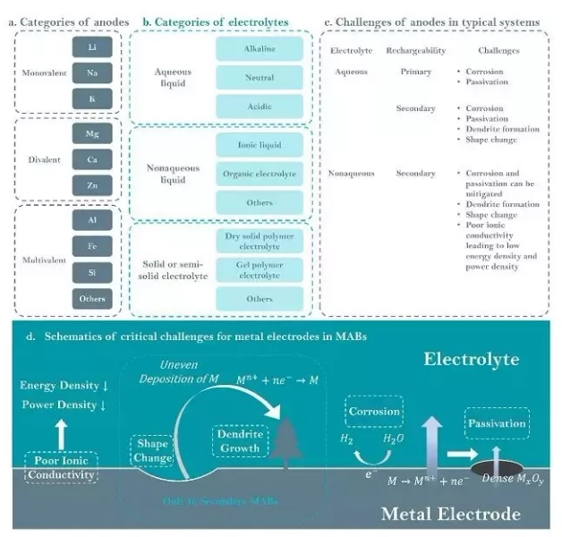 图7.(a)金属电极分类,(b)电解质分类,(c)水系和非水系金属空气电池中金属电极面临的典型问题,(d)枝晶、形变、腐蚀、钝化等金属电极常见问题的示意图
