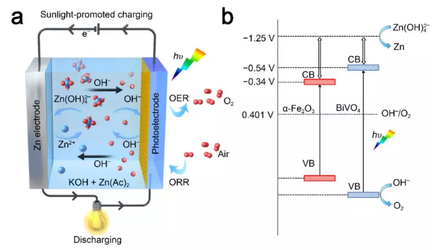 图1. (a)太阳能辅助的可充电锌空气电池的结构以及工作机制示意图。(b)基于两种光电极的充电过程机制分析