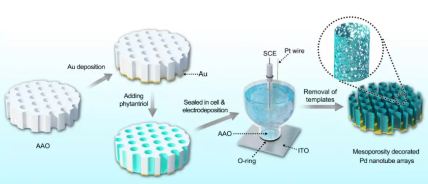 图5. 有机-无机双模板的电化学沉积制备P-PdNTA催化剂的过程示意图