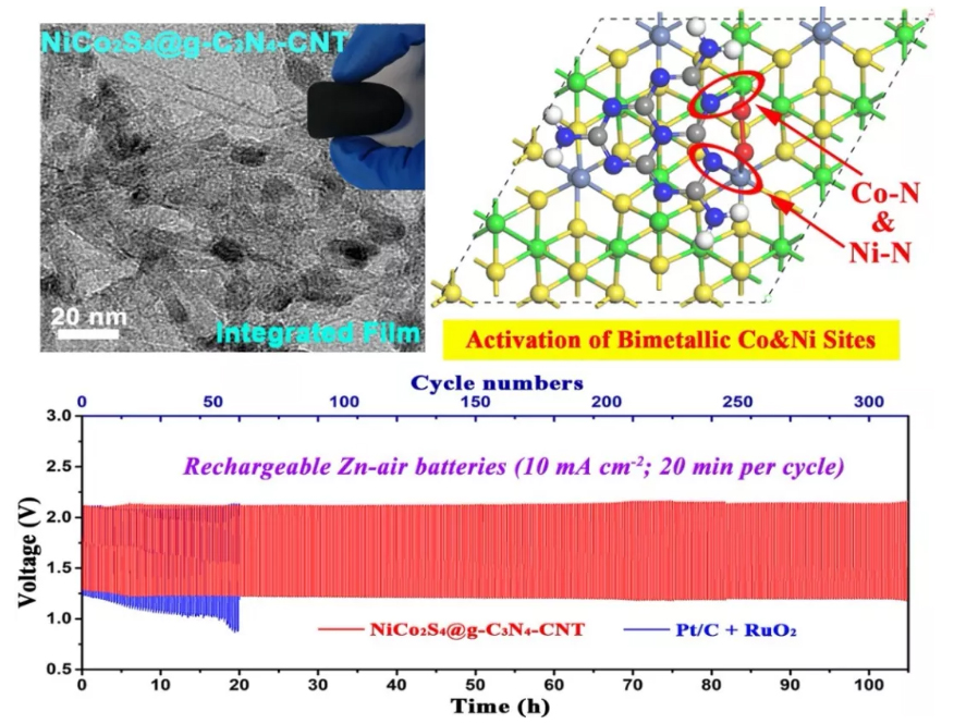 图1. 新型NiCo2S4@g-C3N4-CNT柔性电极促进ORR/OER电催化和锌空气电池性能