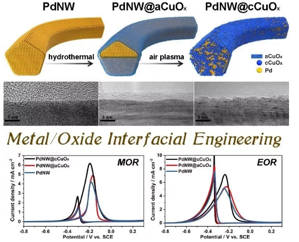 针对这一问题,课题组通过低温等离子处理技术实现Pd-CuOx异质型催化剂界面类型的调控,发现低温空气等离子体处理得到的晶体型CuOx有助于Pd(200)-O-Cu异质界面处Pd的价态升高,高价态Pdδ+活性位点不仅有利于Pd在碱性环境中电催化甲醇、乙醇氧化反应活性提升,也带来Pd表面对醇类氧化含氧中间体,尤其是CO,更高的耐毒化性质。 具体地,研究者构建了一种表面包覆非晶CuOx的Pd纳米线一维结构作为前驱体材料,引入低温等离子体处理技术实现非晶CuOx的晶型转变调控,即Pd-O-Cu界面类型的调控。 在处理过程中,一方面Pd-O-Cu相互作用得到强化,另一方面异质界面处的Pd原子价态显著升高。 高价态Pdδ+活性位点拥有更多d带空位,在催化过程中能够于反应体系中捕获更多的OHads,有利于加快醇氧化中间产物的氧化脱附,提高催化活性。 让人印象深刻的是晶体CuOx修饰的Pd表面对CO耐受性大幅提升,在−0.30 V (vs. SCE)电位下的甲醇氧化过程中,向反应体系内人为引入纯CO气体,反应电流并无明显变化,说明此电位下丰富的Pd-O-Cu晶体型界面具有增强的耐CO毒化性质。 研究者相信,此项研究提供的低温等离子处理策略适用于今后越来越多的异质纳米材料体系中的界面结构调控。