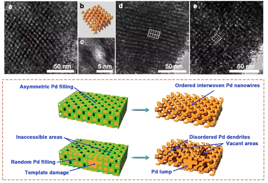 图6.有序介孔Pd的高倍TEM照片以及单钻石结构形成机制示意图
