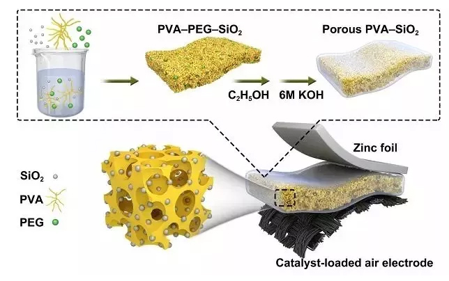 图5. 柔性锌空气电池的组装示意图和多孔纳米二氧化硅复合PVA基聚合物电解质的制备方法及其内部结构