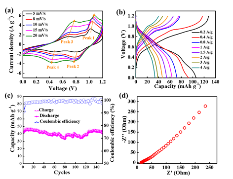 图6(a)不同扫描速率下AIB的典型CV曲线。(b)研究了AIB的充电/放电测试。(c)在1 A g-1的电流密度下执行的AIB的循环稳定性。(d)AIB的电化学阻抗谱(EIS)测试。