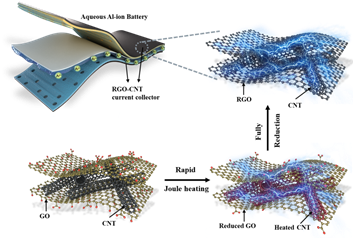 高导电膜型集流体是电池的重要组成部分。除了金属基的集流体之外,轻质和高导电性的碳材料(例如还原的氧化石墨烯(RGO)和碳纳米管(CNT))也具有巨大的潜力。但是,传统的RGO制造通常耗时长且耗能高,降低了产品的合格率和制造效率。而且,制造的RGO的性能需要进一步提高。在这项工作中,研究者们将CNT和GO均匀混合,可以在不到1分钟的时间内通过在2936 K下进行焦耳加热将其直接还原为RGO-CNT。制成的RGO-CNT可实现2750 S cm-1的高电导率,并实现了导电率106倍的增长。以RGO-CNT为集流体,组装的水系Al-离子电池(AIB)在循环稳定性和倍率性能方面具有出色的电化学性能,并且在弯曲、折叠等机械损伤耐受性方面显示了优越的的机械性能,经历穿孔和切割后,电池性能仍保持良好并且无安全隐患。