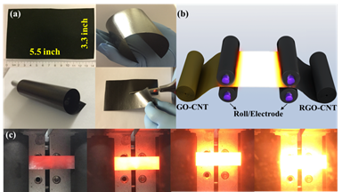 图2.(a)GO-CNT的数码照片,具有出色的机械性能。(b)辊对辊制造系统的示意图,以通过焦耳加热实现GO-CNT的连续生产。(c)在焦耳加热期间,随着输入功率的升高,从RGO-CNT膜发出的光强度增加。比例尺:1cm。