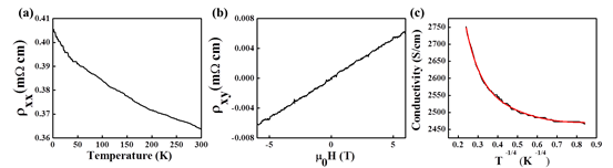 图5.(a)还原的RGO-CNT薄膜的纵向电阻率ρxx(T)与温度的关系。(b)还原的RGO-CNT膜在300 K时的霍尔电阻ρxy(H)的场依赖性。(c)还原的RGO-CNT膜的电导率的自然对数。
