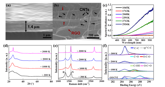 图3.(a-b)RGO-CNT的横截面SEM图像和放大图。(c)RGO-CNT装置的发射光谱,该装置符合黑体辐射方程式,可提取膜的温度。(d-f)分别在1000 K,2000 K,3000 K左右退火的GO-CNT和RGO-CNT的XRD,拉曼光谱、XPS光谱。