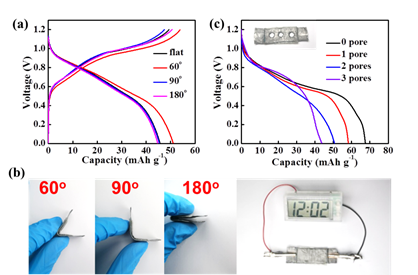 图7(a)当在60°,90°和180°弯曲时,AIB的放电容量。(b)一个铝离子电池可以持续点亮电子表。(c)被穿孔的AIB的充电/放电测试。