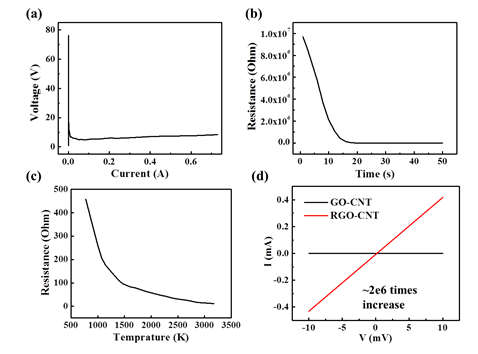 图4.(a)焦耳加热期间GO-CNT的实时IV曲线。(b)退火过程中电阻的变化。(c)GO-CNT的温度-电阻曲线。(d)GO-CNT和RGO-CNT的典型I-V曲线。