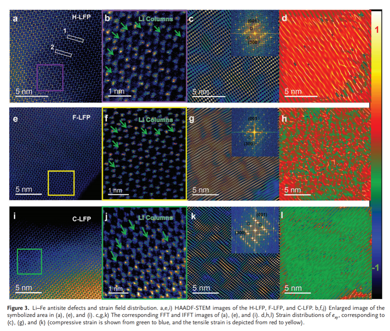 图3:多维耦合结构的可视化。展示了H-LFP、F-LFP和C-LFP中Li-Fe反位缺陷的分布,以及晶格应变的分布。