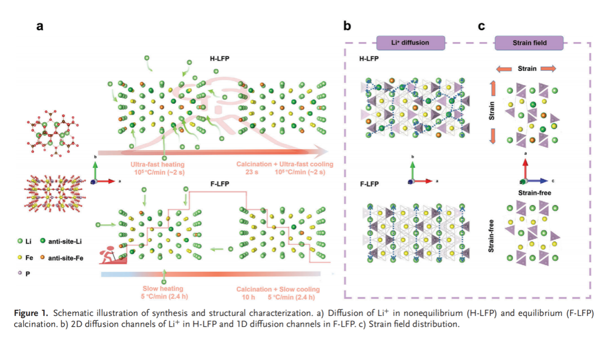图1:H-LFP和F-LFP中反位点缺陷和晶格应变的形成示意图。展示了H-LFP和F-LFP中反位点缺陷的形成过程,Li+的二维和一维扩散通道的对比,以及应变场分布。