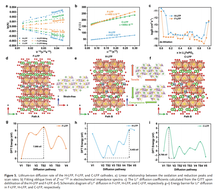图5:Li扩散动力学与多为耦合结构之间的构效关系。通过循环伏安(CV)和电化学阻抗谱(EIS)测试,分析了H-LFP、F-LFP和C-LFP中锂离子扩散速率,通过GITT测试定量评估了电极材料在充放电过程中的扩散系数,并通过第一性原理计算得到了Li+在不同结构中的扩散能垒。