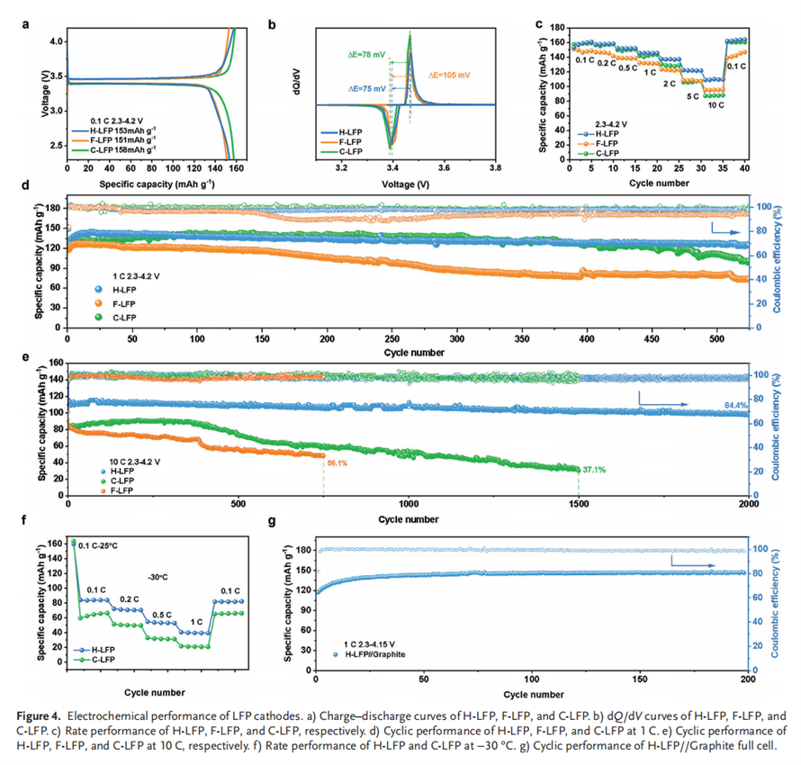 图4:电化学性能。展示了H-LFP、F-LFP和C-LFP的电化学性能,包括充放电曲线、dQ/dV曲线、不同电流密度下的倍率性能、循环性能,以及在-30°C下的低温性能测试。