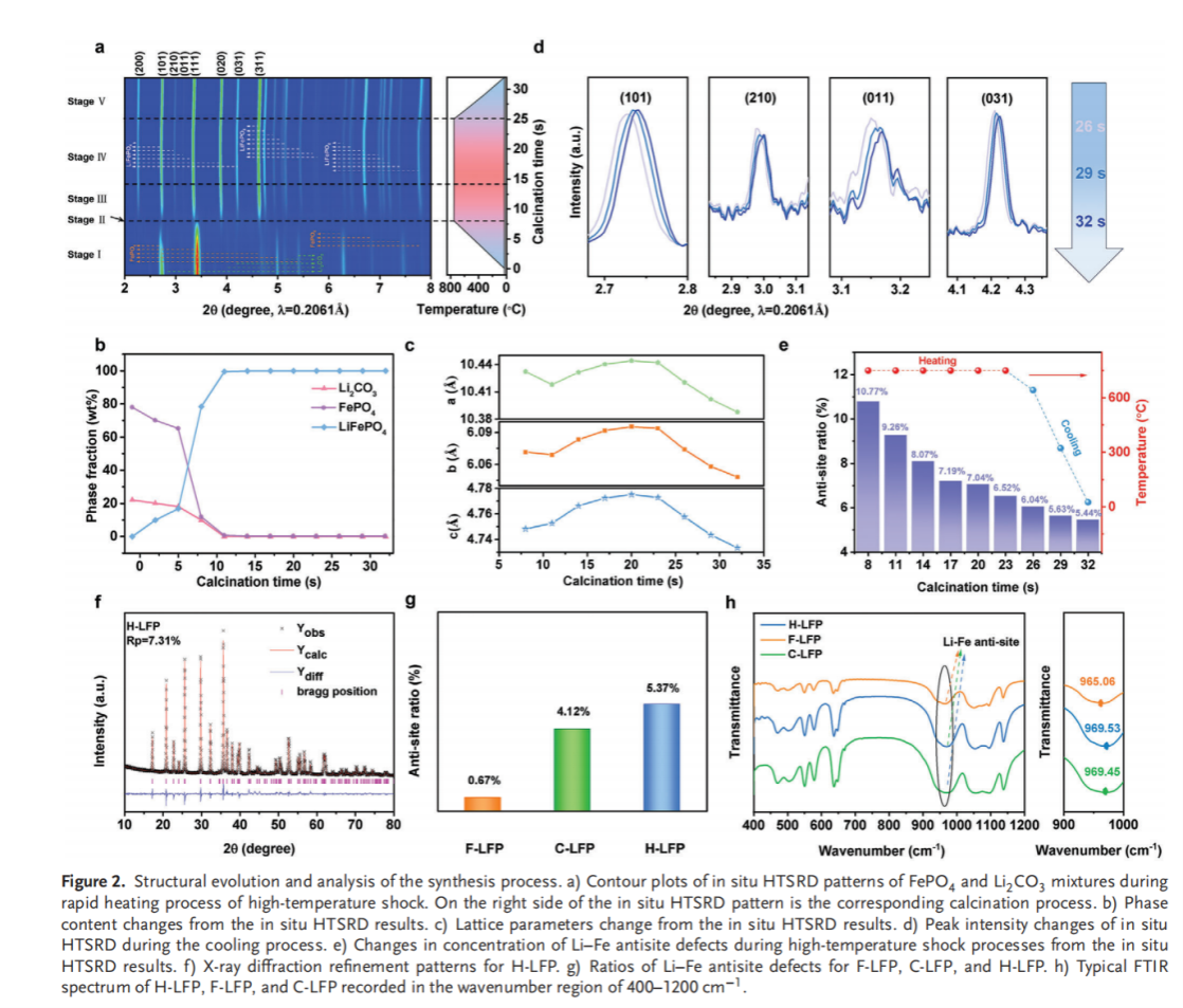 图2:非平衡高温热冲击过程中结构演化。展示了非平衡高温冲击过程中LFP的相含量的变化、晶格参数的变化,以及Li-Fe反位缺陷浓度的变化。并对H-LFP,F-LFP以及C-LFP中反位点缺陷浓度进行了对比。