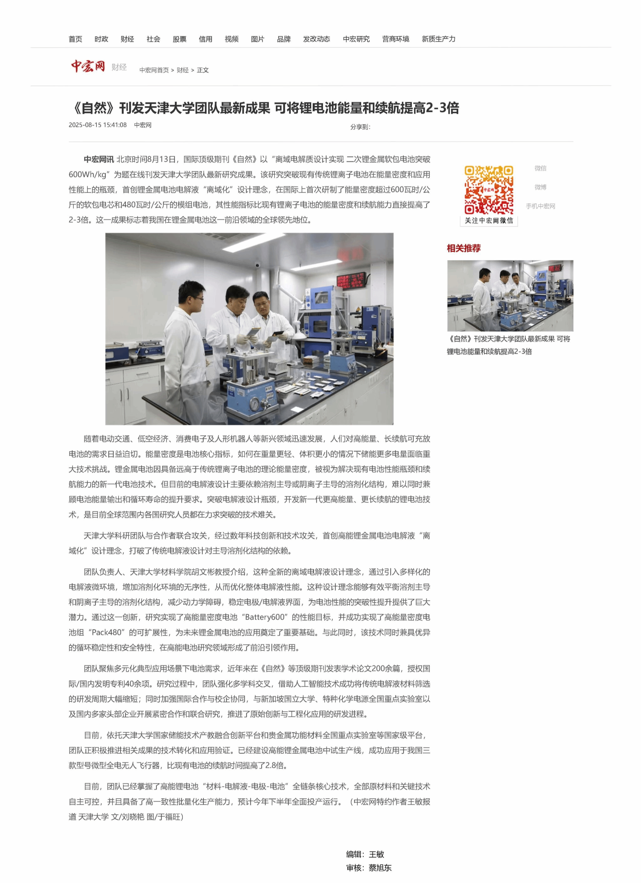 中宏网:《自然》刊发天津大学团队最新成果 可将锂电池能量和续航提高2-3倍