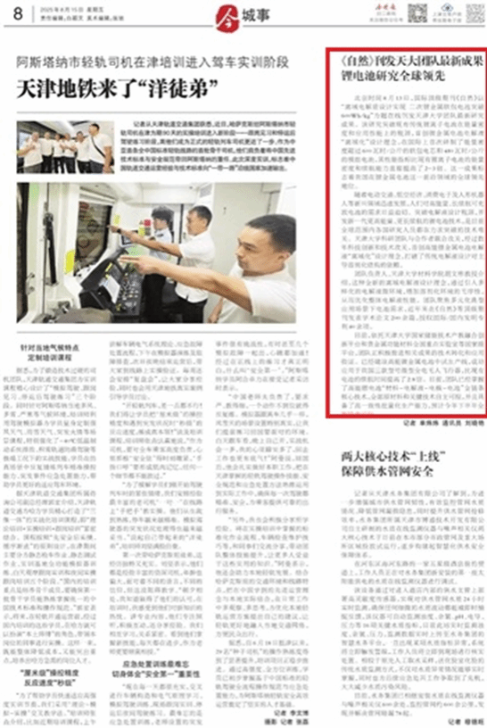 中国教育报头版:天津大学科研团队在锂金属电池领域取得新突破 锂电池续航能力有望提高2至3倍