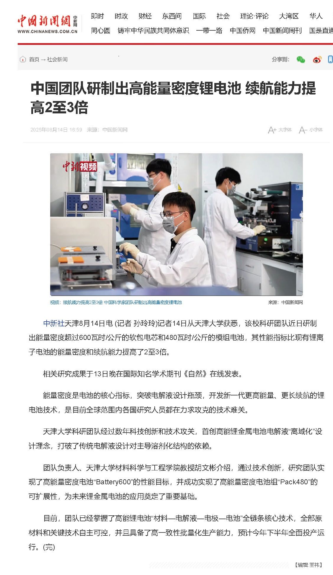 中国新闻网:中国团队研制出高能量密度锂电池 续航能力提高2至3倍