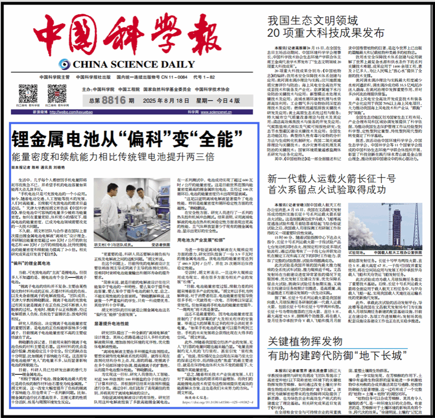 中国科学报头版头条:锂金属电池从“偏科”变“全能” 能量密度和续航能力相比传统锂电池提升两三倍