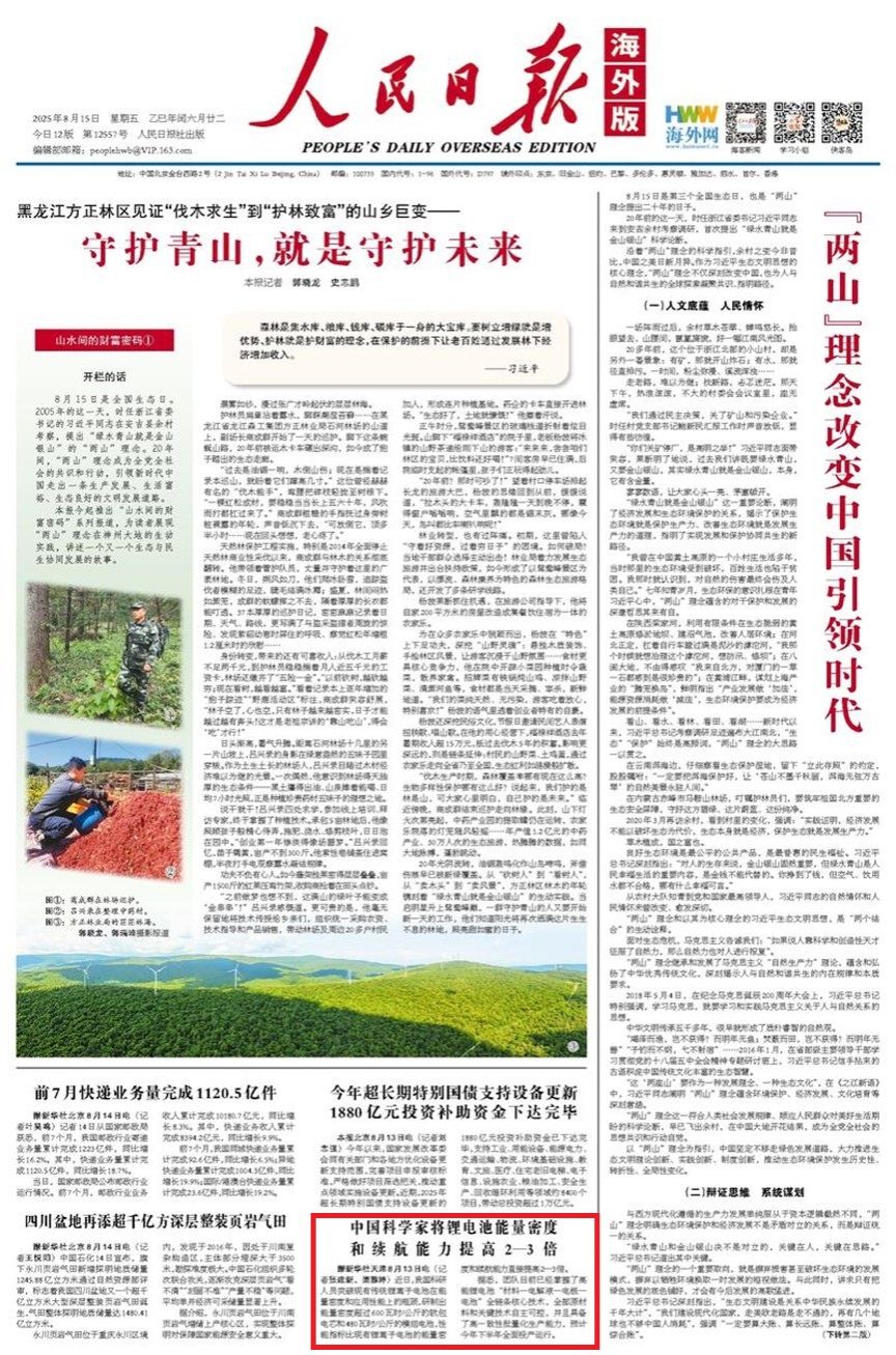 人民日报海外版头版:中国科学家将锂电池能量密度和续航能力提高2~3倍